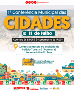 1° Conferencia Municipal das cidades #MUNICÍPIO Vem aí a 1ª Conferência Municipal das Cidades!! 🗓️ Dia 11 de julho, São Sebastião do Uatumã se reúnirá Notícia completa